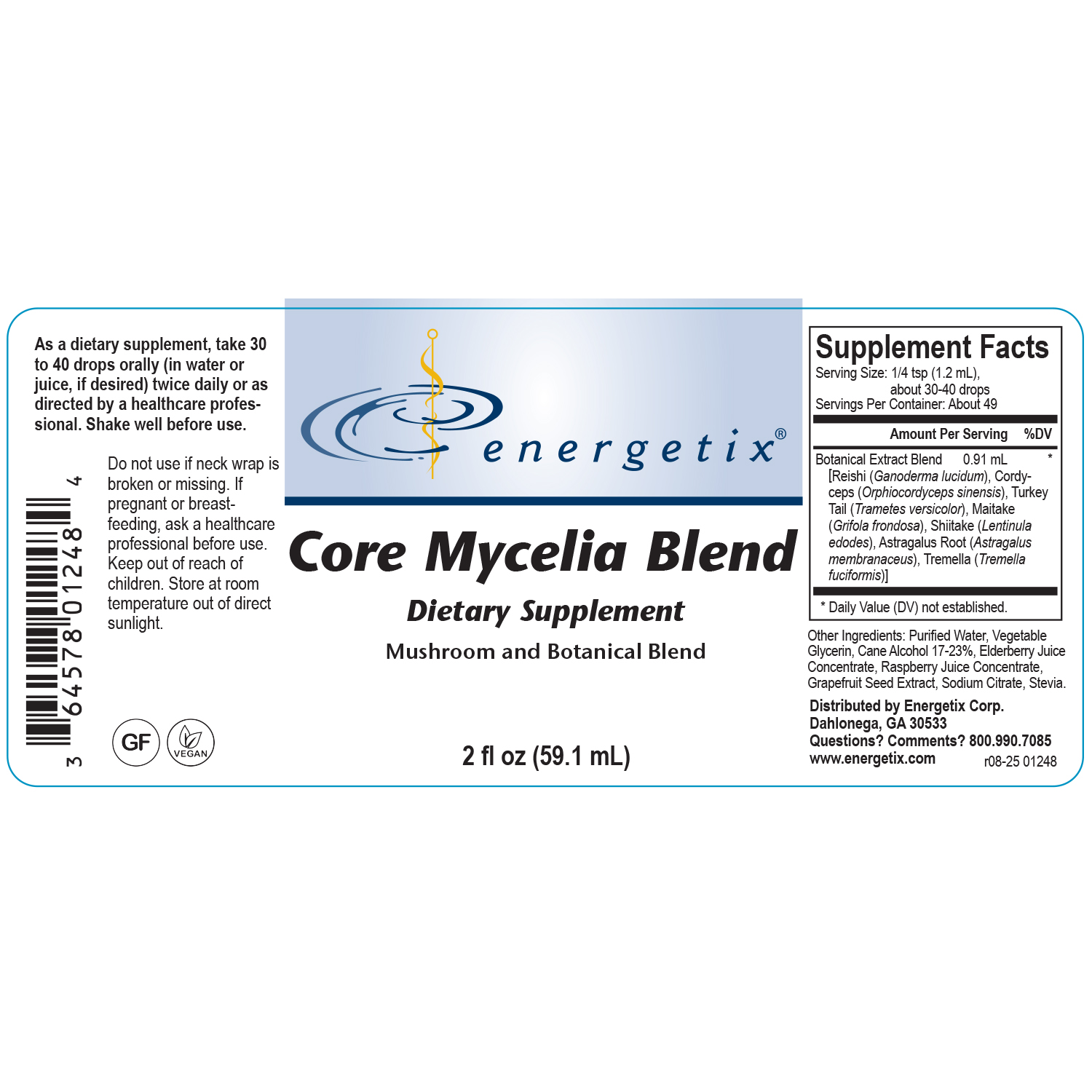 Core Mycelia Blend is a spagyrically processed blend of traditional mushrooms that includes reishi, cordyceps, turkey tail, maitake, shitake, and tremella combined to support healthy immune response, cellular integrity and function, and normal stress response.*