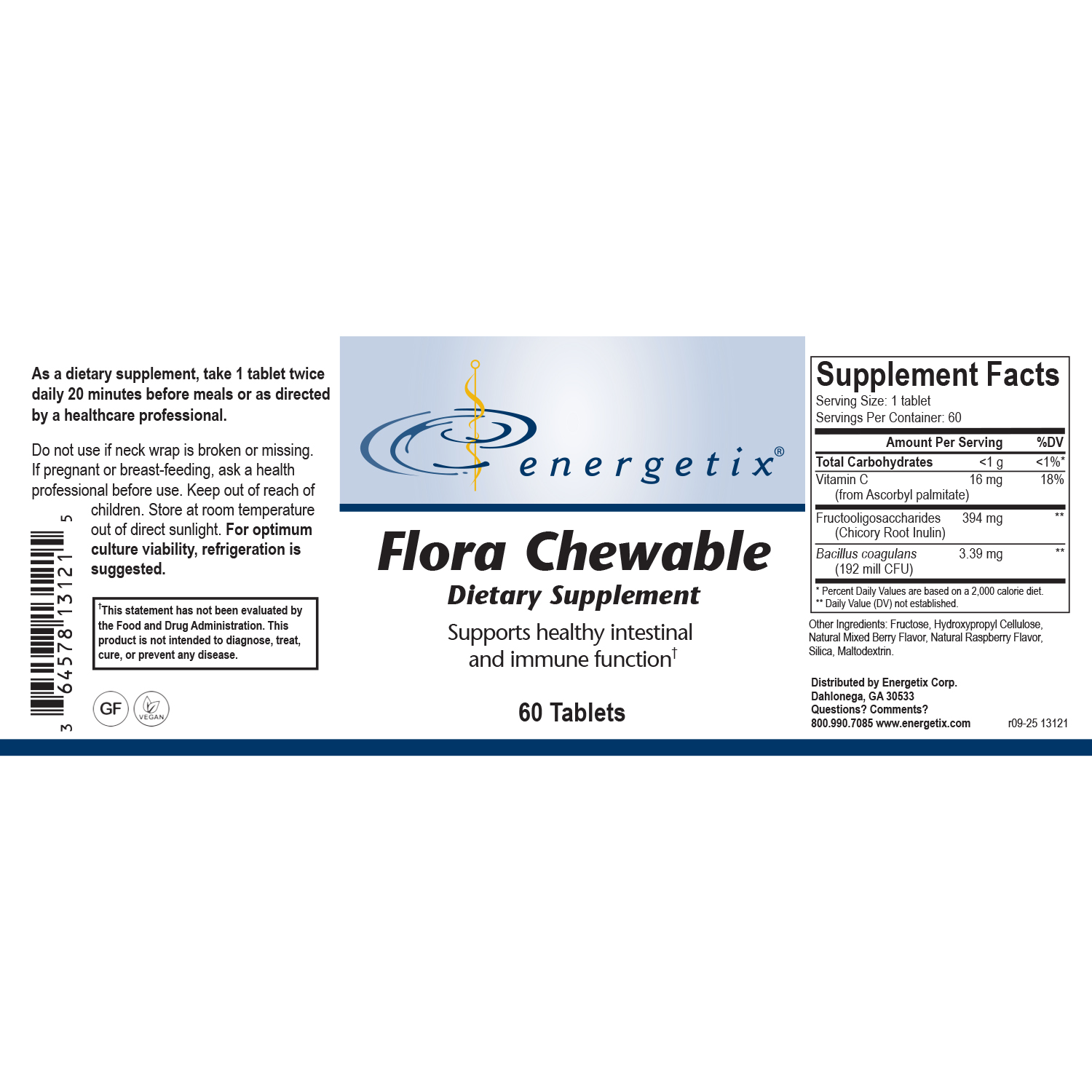 Flora Chewable contains the spore form probiotic Bacillus coagulans and prebiotic fructooligosaccharides (FOS), also called Chicory Root Inulin, to help support normal immune and digestive response. Bacillus coagulans—a lactic acid-producing bacterial endospore nourished by the prebiotic—aids in maintaining normal intestinal microflora balance.*