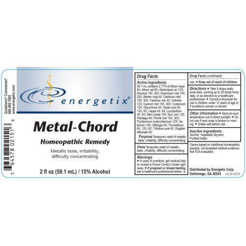 Metal-Chord is a homeopathic combination formula for symptoms related to the presence of heavy metals. Besides homeopathically-prepared metals, the formula also contains homeopathically-prepared herbs such as barberry, milk thistle, and burdock. Practitioners find it helpful to use Drainage-Tone® or Lymph-Tone I® , II® , or III® with this product.